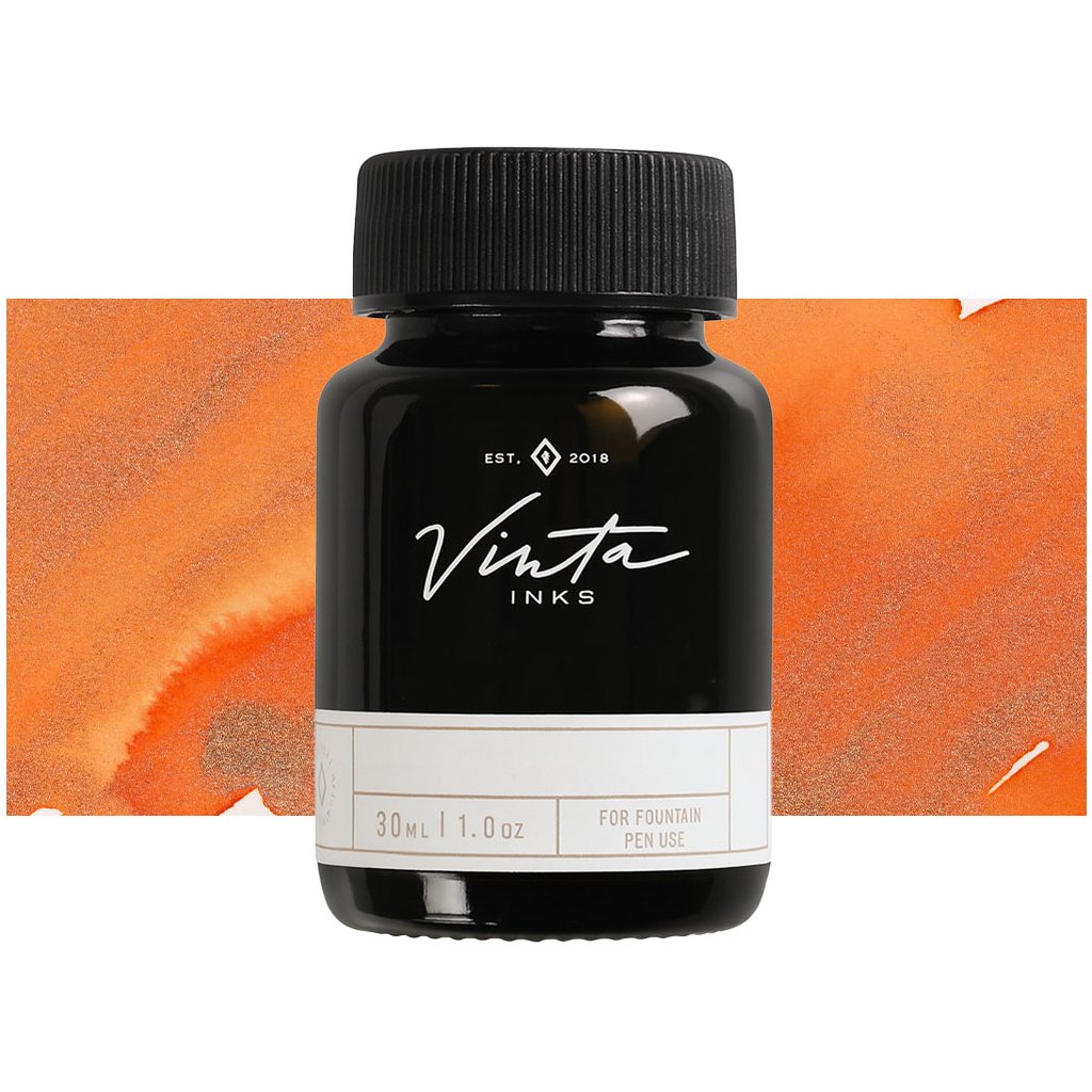 Skleněná lahvička kouřové barvy s inkoustem je pečlivě zabalena v papírové krabičce se zlatou ražbou. Inkoust je rychleschnoucí, na vodní bází - není voděodolný. Svým složením jsou inkousty Vinta vhodné pro plnicí pera i kaligrafii.