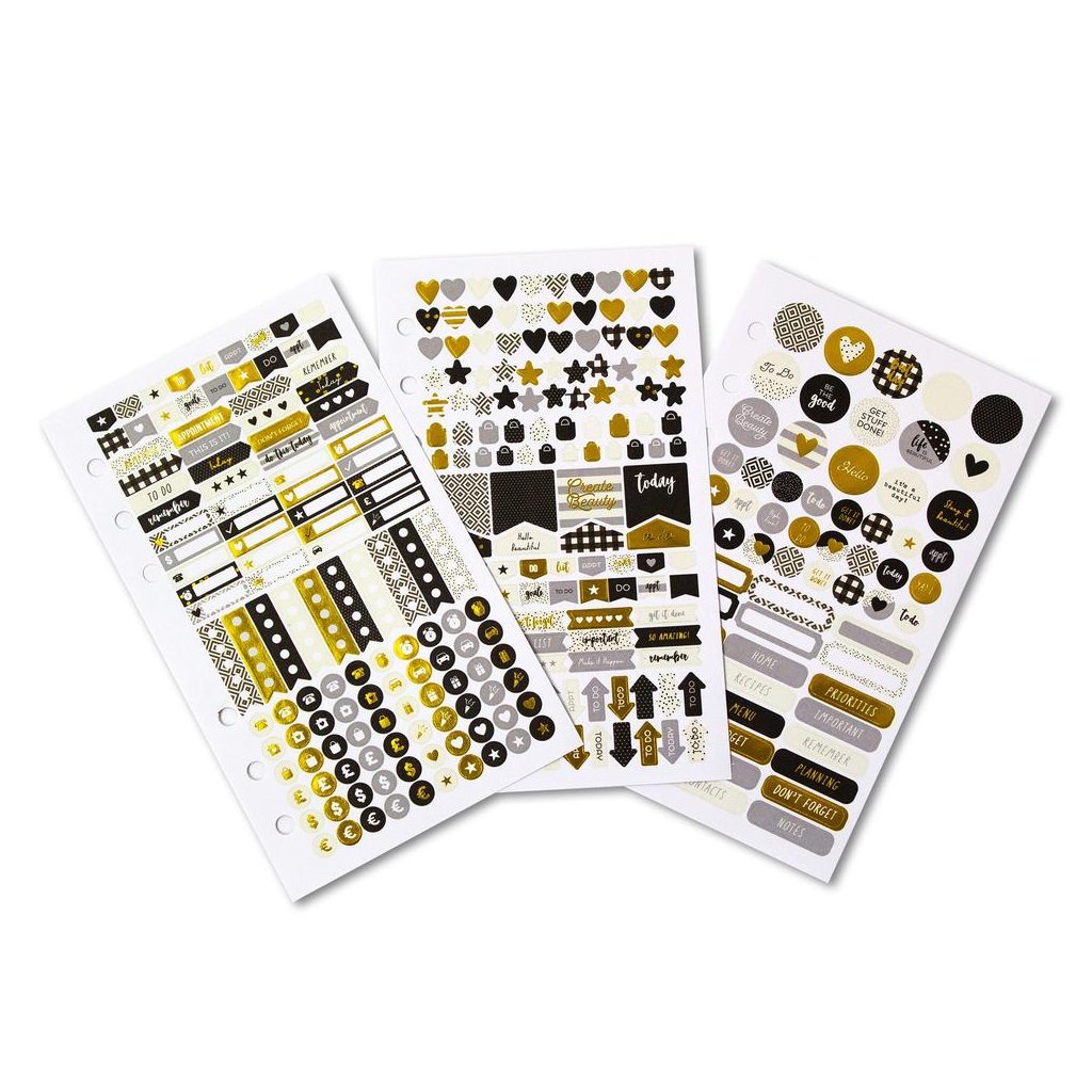 Součástí jsou tři aršíky samolepek do diáře, které mají metalické detaily ve zlaté barvě. Díky nim můžete svůj diář dozdobit a užít si kreativní a zábavné plánování.