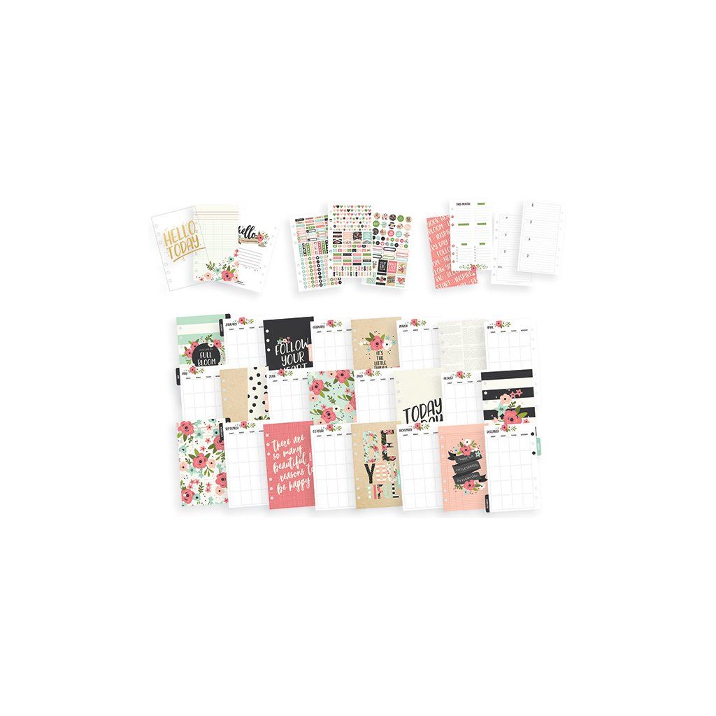 Desky diáře mají vazbu se 6-ti kroužky. Uvnitř desek naleznete spoustu přihrádek na založení poznámek, samolepek, karet či jiných drobností. Zapínání desek je na patentek. Součástí je také ozdobný kovový přívěsek a nedatovaná náplň diáře. Svůj diář můžete navíc rozšířit o spousty krásných doplňků.