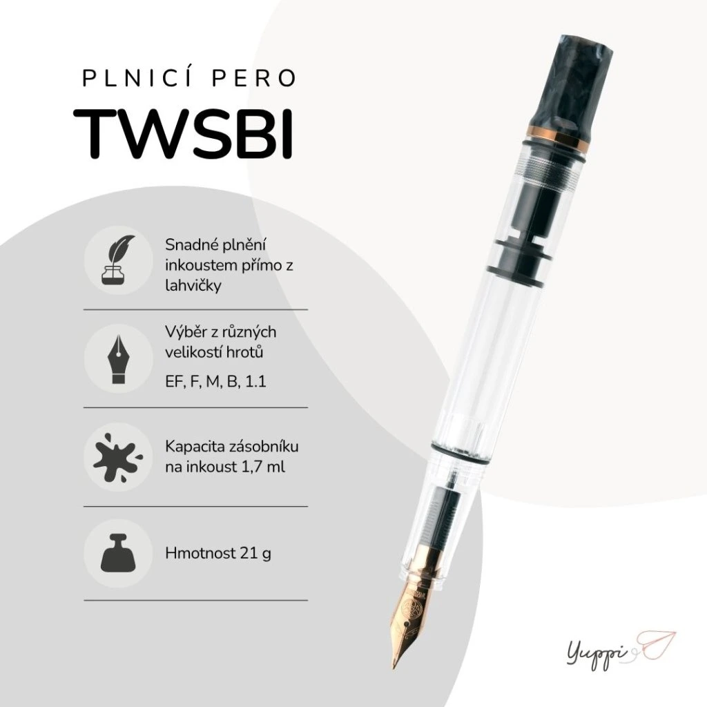 TWSBI je plnicí pero, které nejen skvěle píše, ale zároveň vás bude bavit používat. Je krásné, praktické a díky svému průhlednému tělu odhaluje každý detail – od hladiny inkoustu až po promyšlený vnitřní mechanismus.