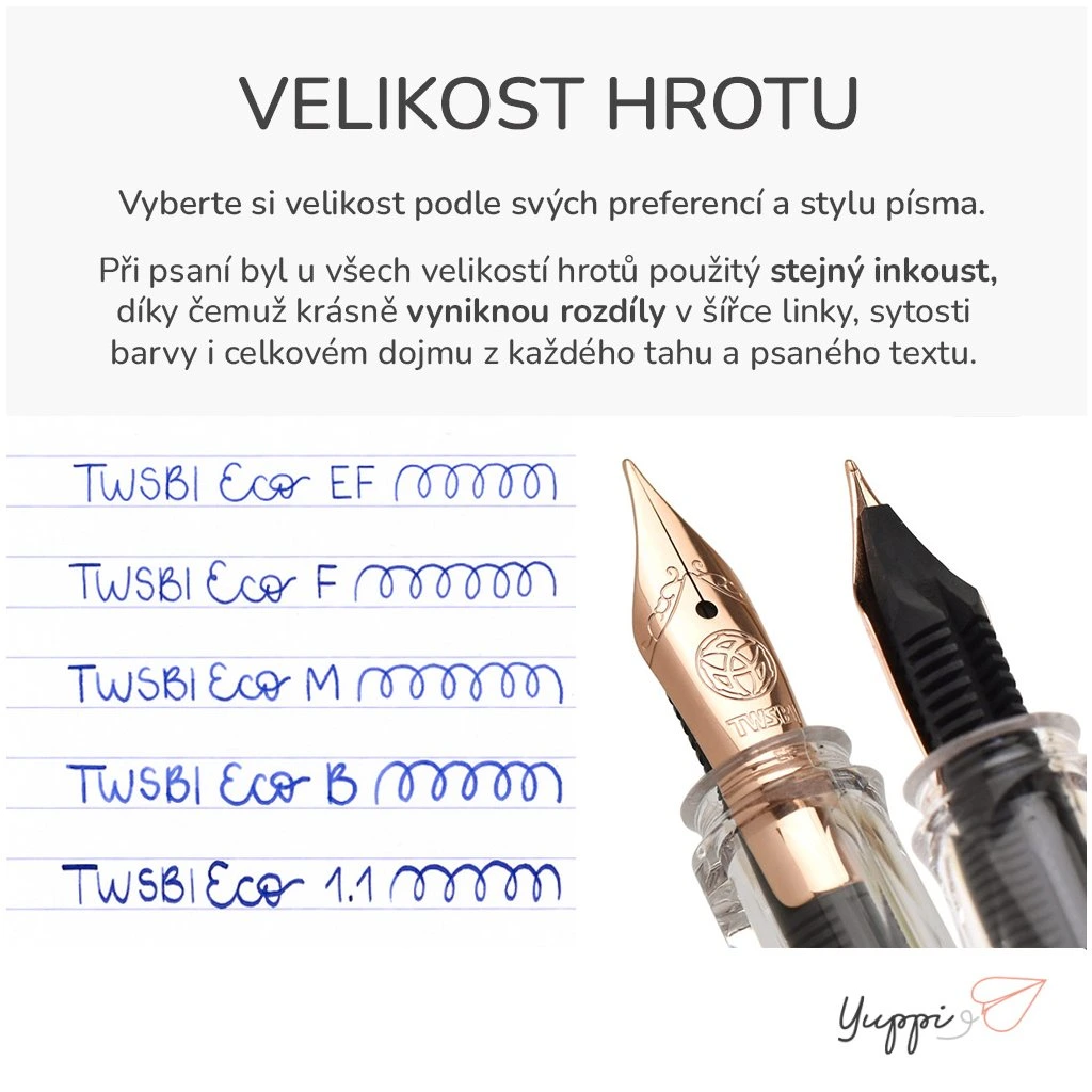 Vyberte si ten pravý hrot pro vásHrot z nerezové oceli, vyráběný renomovanou firmou JoWo, zajišťuje plynulý tok inkoustu a příjemný kontakt s papírem. Neškrábe ani nevynechává. Vybrat si můžete hrot přesně podle svého stylu psaní – od extra jemného EF, přes jemný F, střední M až po široký B nebo kaligrafický stub 1.1. Pokud dáváte přednost precizním linkám a drobnějšímu písmu, doporučujeme varianty EF nebo F. Pro plynulé psaní s výraznější stopou skvěle poslouží velikost M, B nebo elegantní stub, který se hodí i na zdobnější písmo. 🖋 Yuppi tip: Chcete, aby inkoust skutečně vynikl? U širších hrotů (M, B, stub) vyniknou barevné odstíny i speciální efekty – jako je stínování, lesk nebo třpytky – mnohem lépe než u tenčích variant. |